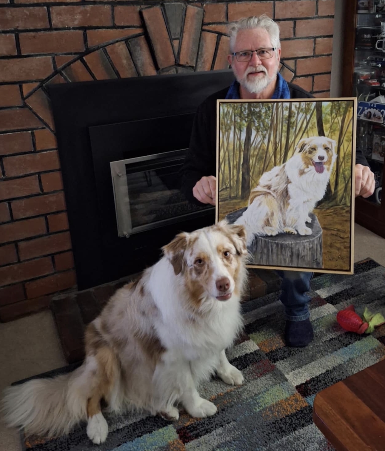 Below is the reference photo and Missy with her owner holding the finished portrait.