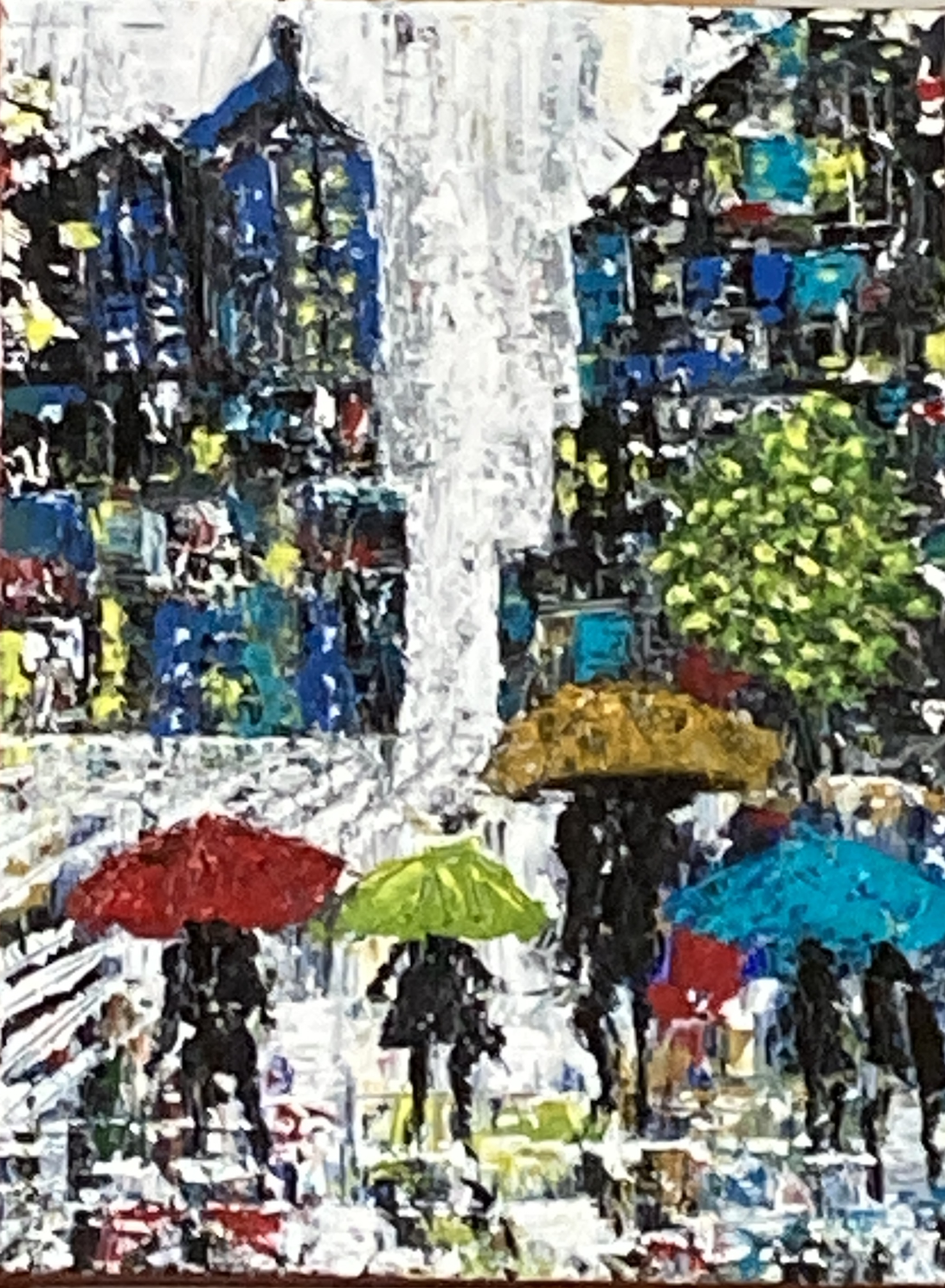Textured colourful painting depicting heavy rain blurring what the eye sees.